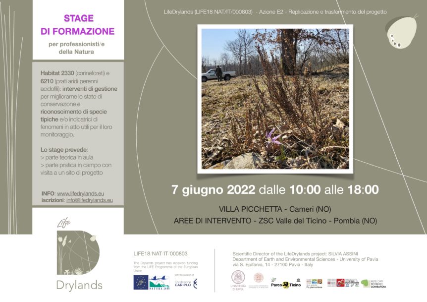The training INTERNSHIP under Action E2 of the project is starting. When: June 7th from 10 a.m. to 6 p.m. Where: Villa Picchetta, Cameri (NO). What: classroom lessons and site inspections (ZSC Valle del Ticino). To discover Habitats 2330 (coryneform) and 6210 (acidophilic perennial arid meadows) up close. To learn recognize the typical species and/or the ongoing phenomena’s indicators useful …