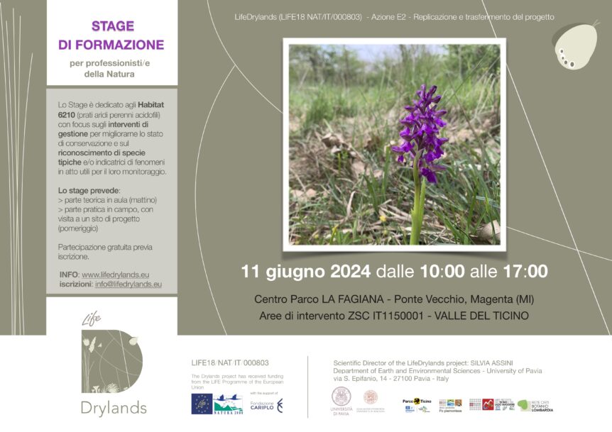 Per scoprire da vicino l’Habitat della Prateria arida (H6210 – Prati aridi perenni acidofili), imparare a riconoscere le specie tipiche e/o indicatrici di fenomeni in atto utili per il monitoraggio, conoscere quali sono gli interventi di gestione per migliorare lo stato di conservazione degli Habitat.